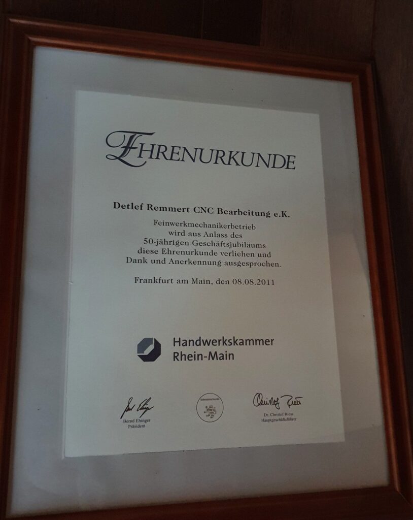 Urkundenverleihung der Handwerkskammer Rhein-Main am 08.08.2011 zum 50. Betriebsjubiläum!
